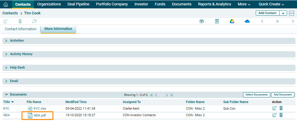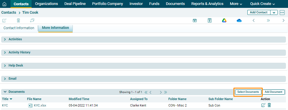 2. Click on the More Information tab. There are several panels here, including the Documents panel. Click on Select Document button in the top right corner of the panel.