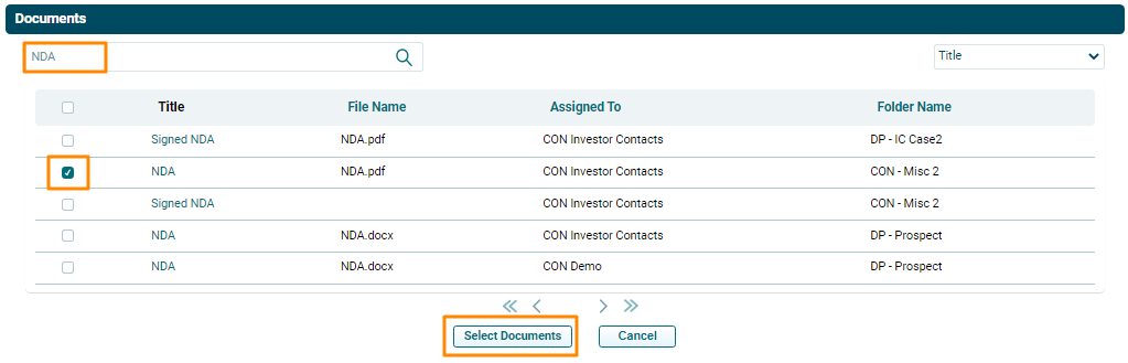 3. The Documents window is displayed. Type the file name in the search box. Check the checkbox against the file name. Click on Select Documents button.