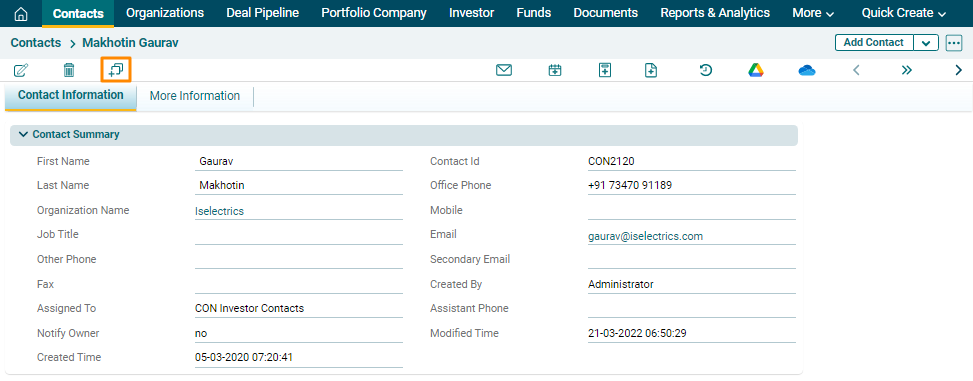 2. The Contact Information window is displayed. Click on the Duplicate icon in the top left corner.
