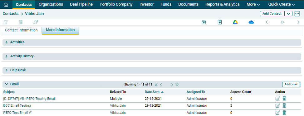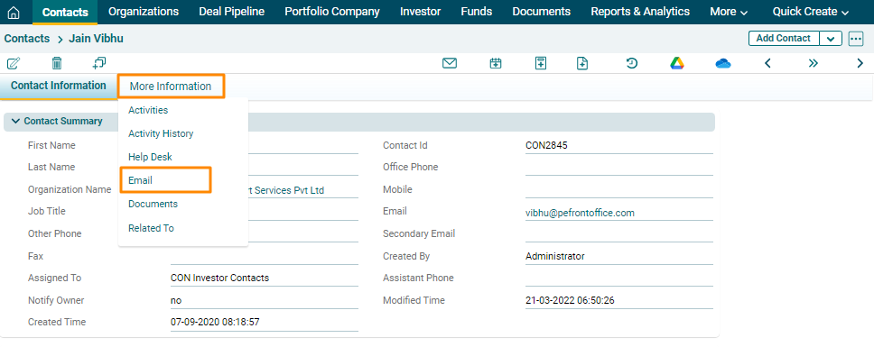 emails can be attached to a particular contact from Outlook Plugin. To view