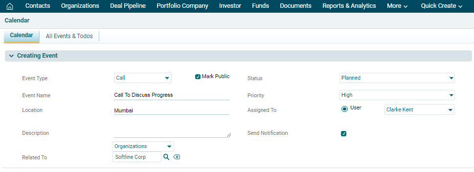 Create an Event and send calendar invites for calls or meetings
