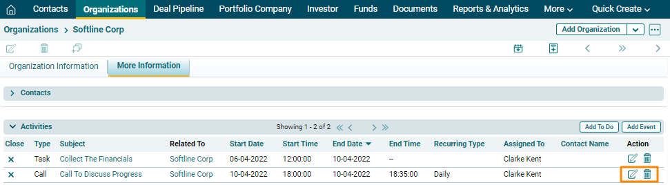 9. The Event will be listed in the Activities Panel under the More Information Tab. Click on the Edit or Delete icons to make changes.