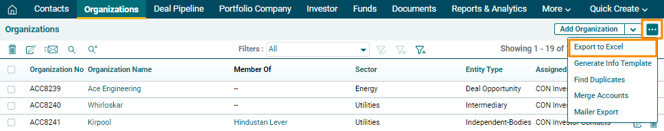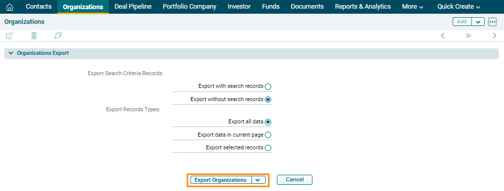 is displayed. Select the export options and click Export Organization. Click on the down arrow