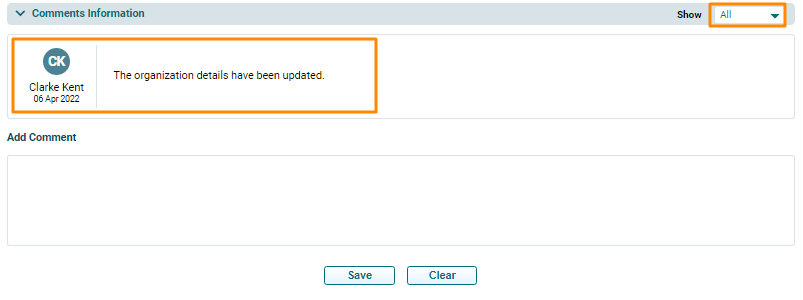 Once you have added a comment, it cannot be deleted. It is always displayed in the Comments section. You can also apply the Show filter to see relevant comments.