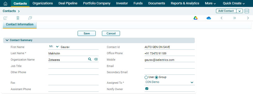 3. The Contact Information window is displayed. Update all the mandatory fields marked with an asterisk and click Save.