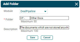 3. The Add Folder Window is displayed. Choose a module from the dropdown. Based on the module, the folder prefix is auto-populated, i.e., DP for Deal Pipeline. Enter the description. Click Save.