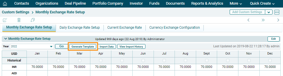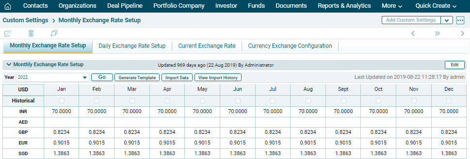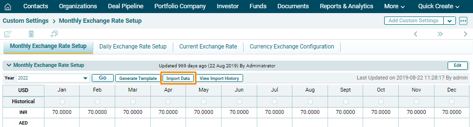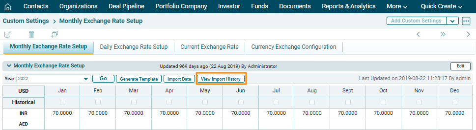 The Currency Import History window is displayed which shows when were the changes made and by whom. You can also download the Currency Sheets.