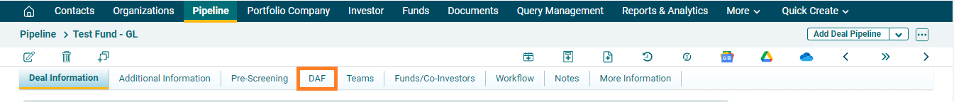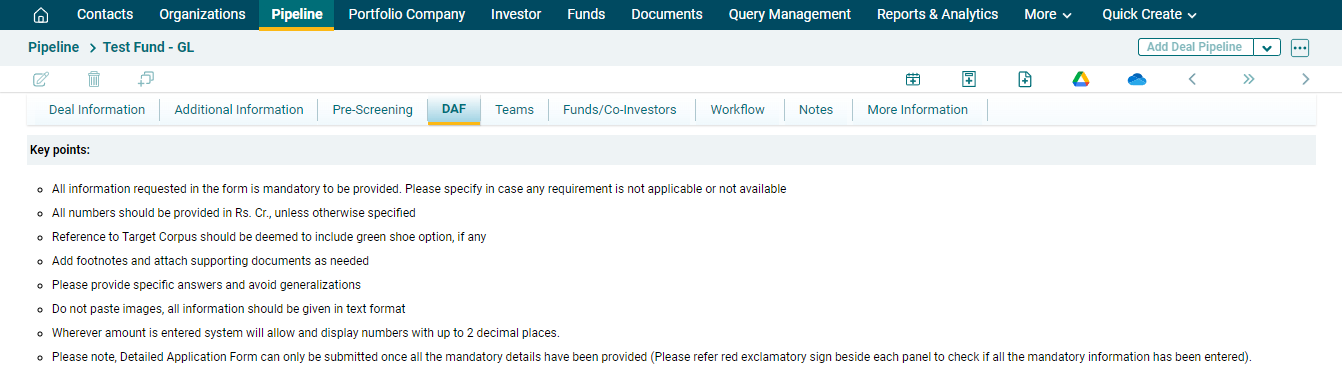 Once the preliminary screening form is accepted by SRI, the deal stage is moved to DAF which stands for Detailed Application Form and a new tab DAF is visible to AIF under Pipeline module. It is mandatory for an AIF user fill complete details in all the panels under DAF to proceed further in the application process.