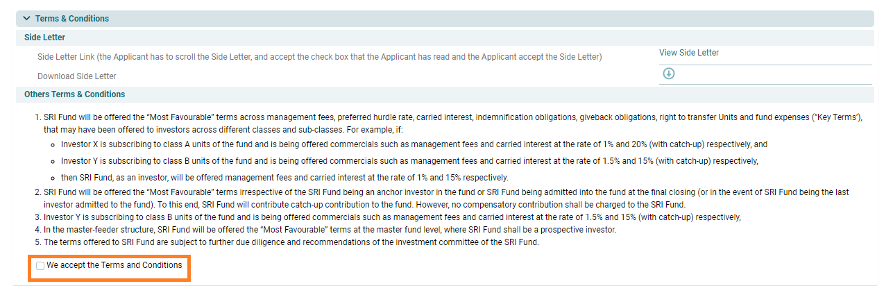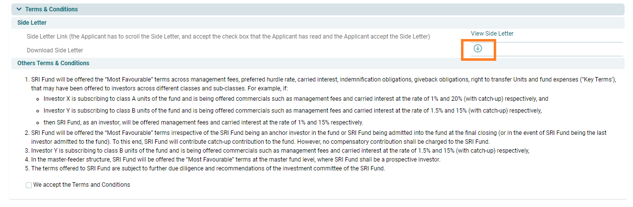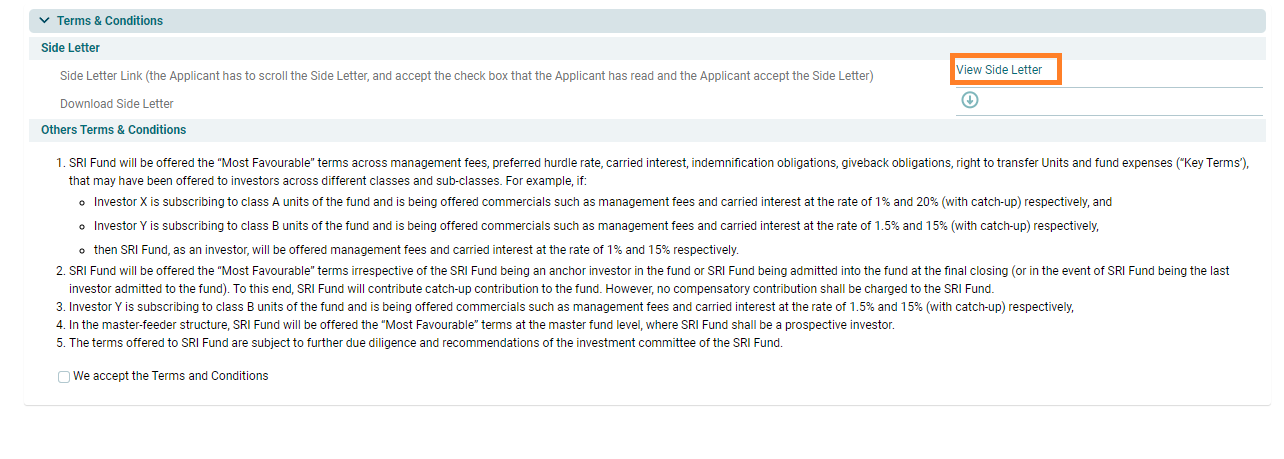 In this panel AIF user has to view the side letter by clicking on the View Side Letter and ticking the checkbox below of the side letter.