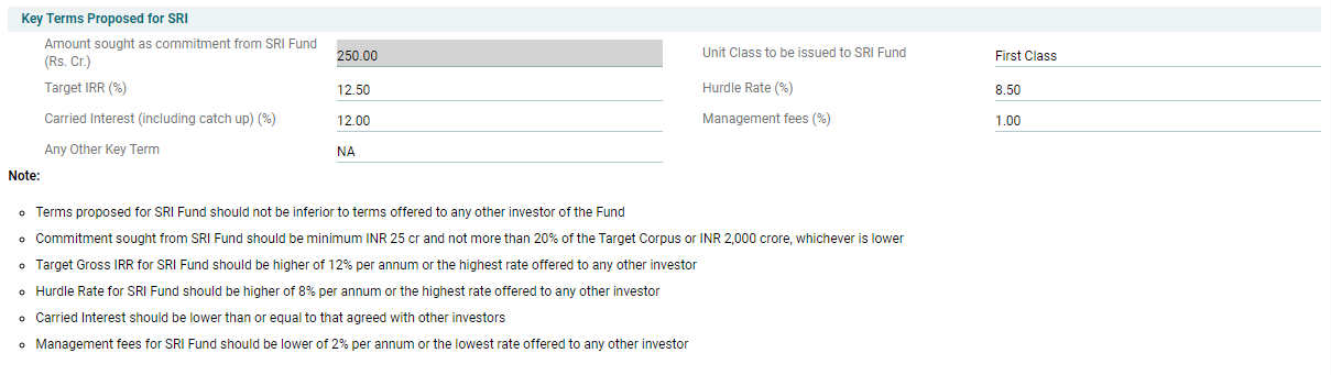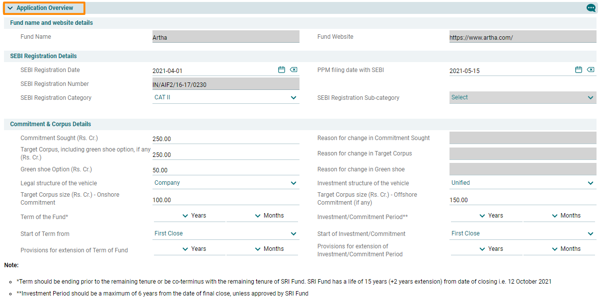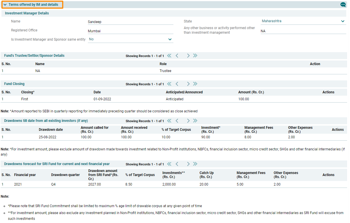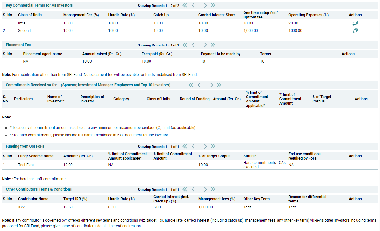 In this sub-panel AIF user needs to fill the details regarding total commitment, corpus fund, term of the fund, reasons for changes in amount, etc.
