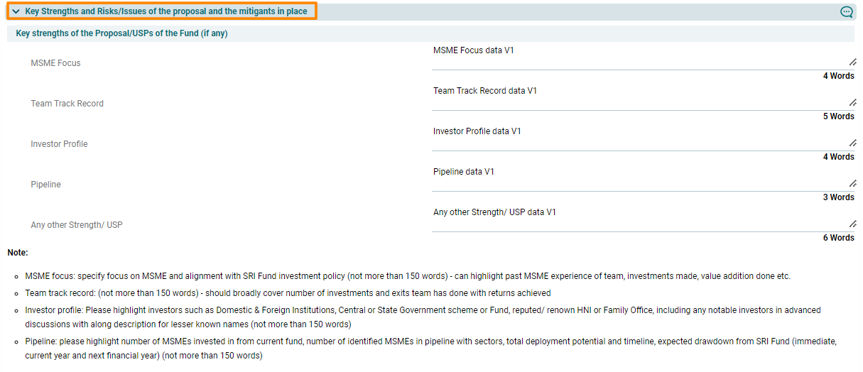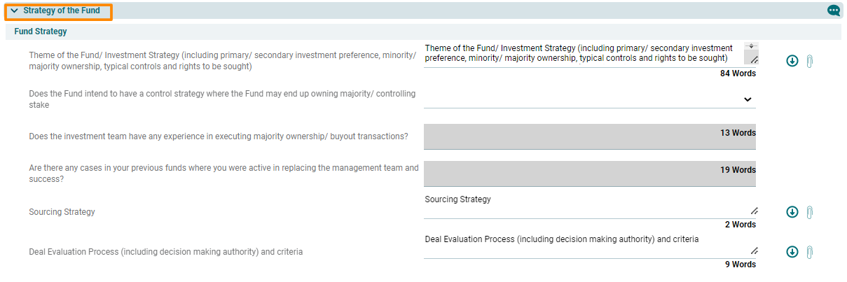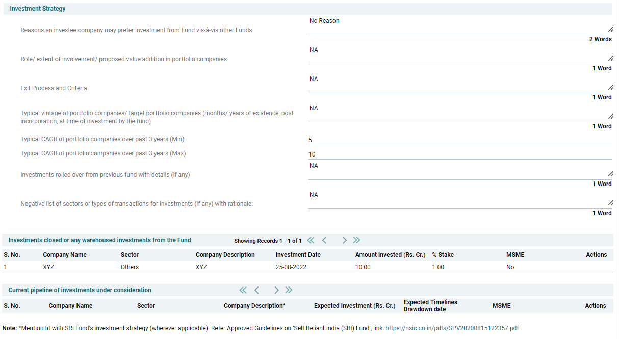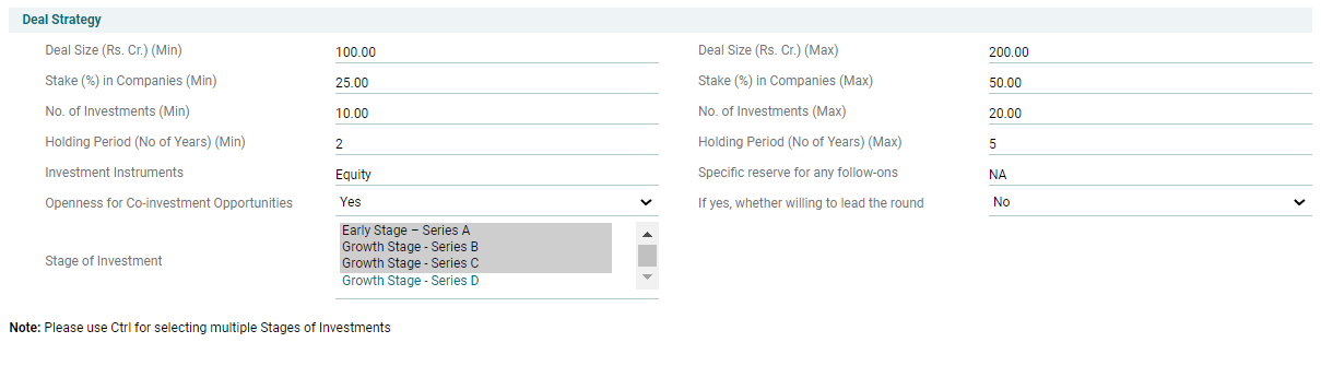 In this sub-panel AIF user needs to enter the theme of the fund, its control strategy, team’s expertise in handling such projects, sourcing strategy, evaluation process and criteria, etc.