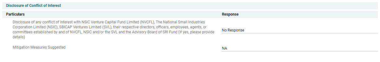 In this sub-panel AIF user needs to mention the details of any conflict of interest that any ey person is facing with NSIC Venture Capital Fund Limited (NVCFL), The National Small Industries Corporation Limited (NSIC), SBICAP Ventures Limited (SVL), their respective directors, officers, employees, agents, or committees established by and of NVCFL, NSIC and/or the SVL and the Advisory Board of SRI Fund (if yes, please provide details).