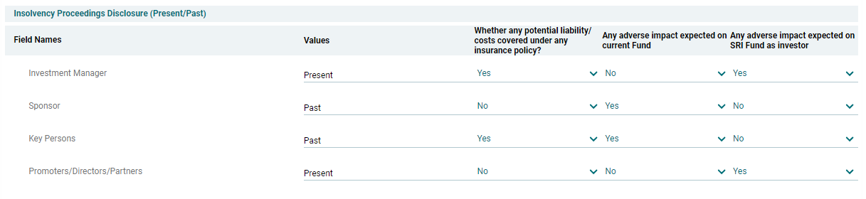 In this sub-panel AIF user needs to enter the disclosures if Investment Manager, Sponsor, Promoters/ Directors/ Partners or Key persons are facing or have faced any insolvency proceedings.