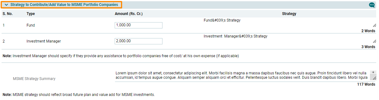In this panel AIF user needs to enter the strategy of contribution to other MSME portfolio companies.