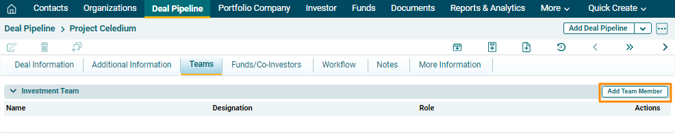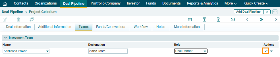 Investment Team panel captures details of internal team members associated with the deal. The details included are: