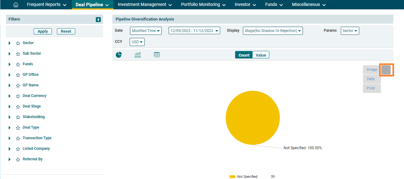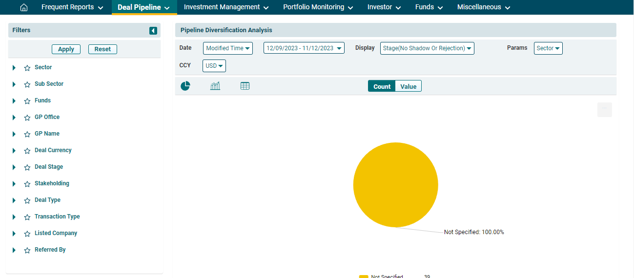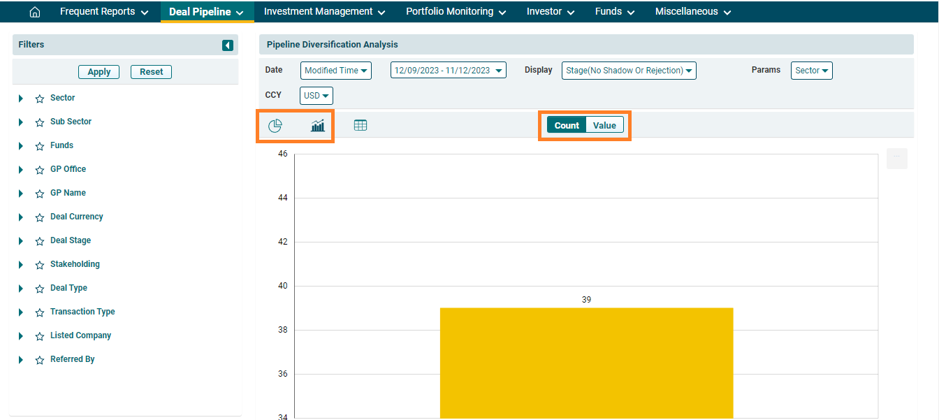The data can be viewed by Count or Value. The default setting is set on Count. If you wish to view the pipeline by Value, switch to Value.