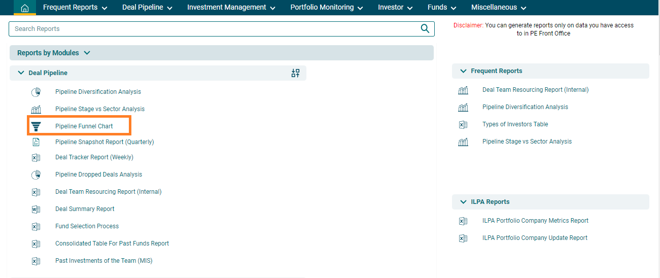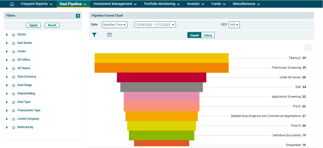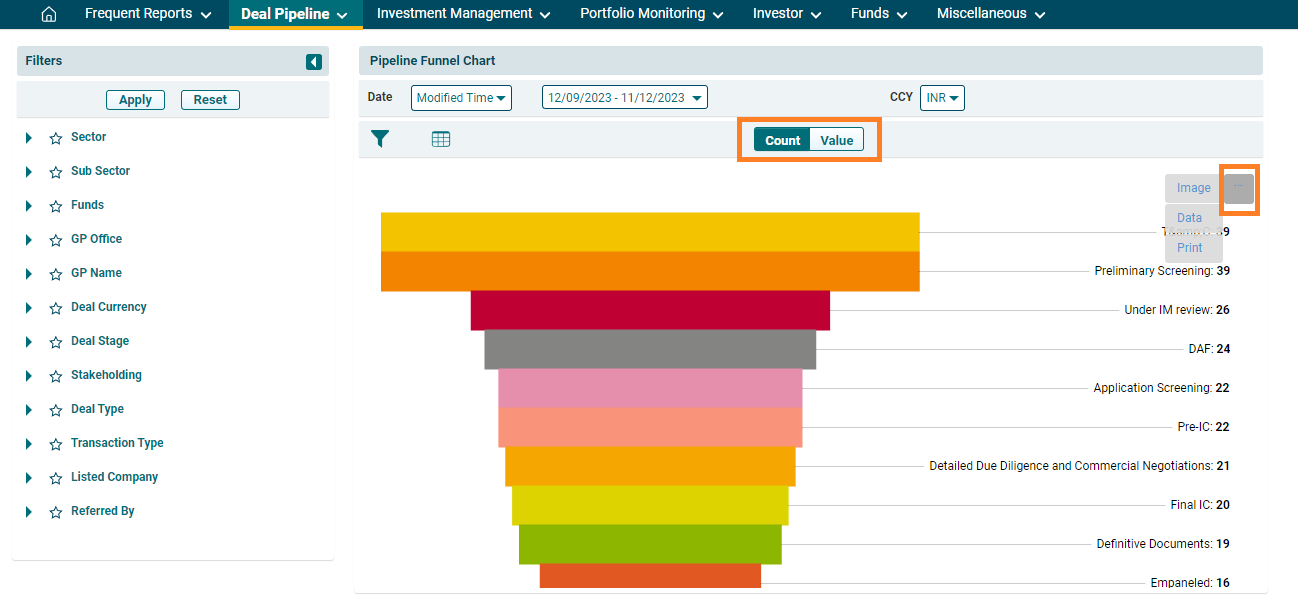 access the report from the dashboard by clicking Pipeline Funnel Chart in the Deal panel or from the Deal drop-down menu in the blue vertical