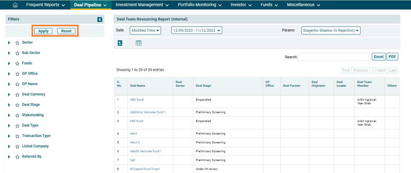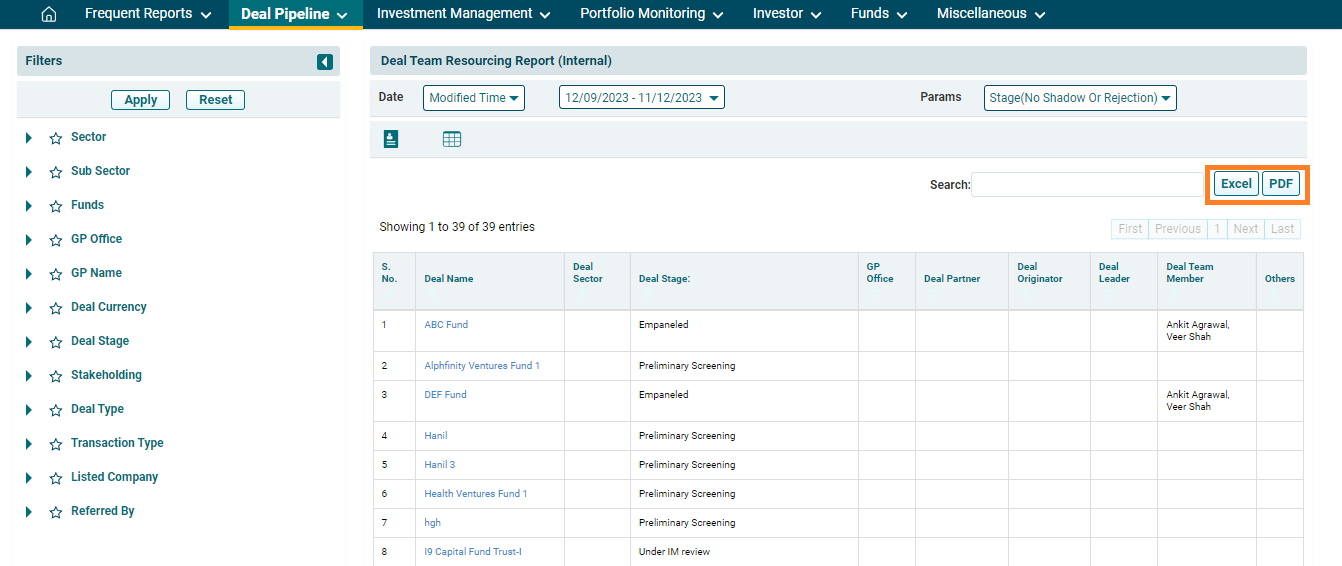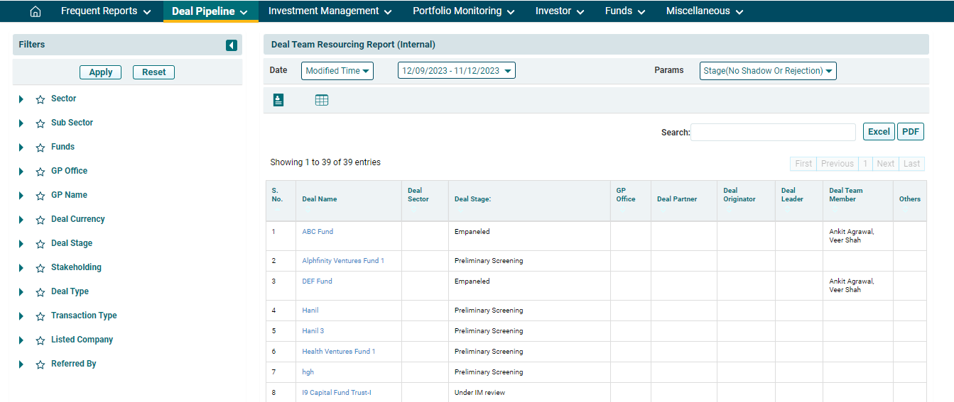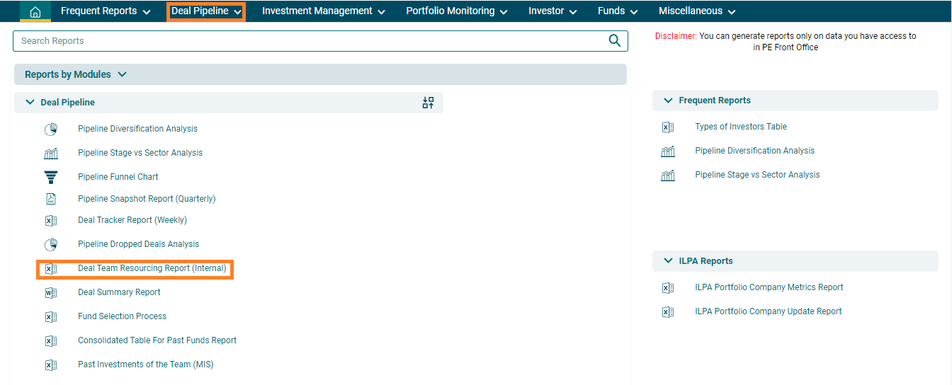 access the report from the dashboard by clicking Deal Team Resourcing Report (Internal) in the Deal panel or from the Deal drop-down menu in the blue vertical