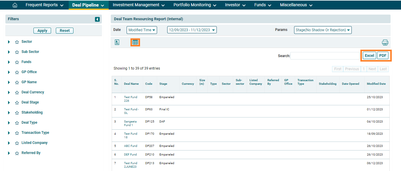5. You can also view the underlying dataset for the above data grid. Click on the Data Set icon. You can download the dataset in Excel and PDF format. Click on the desired format to download.