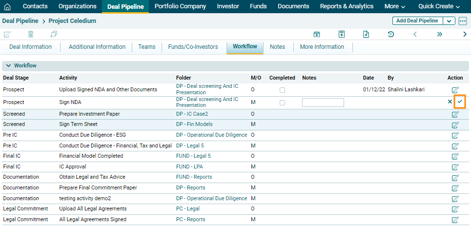 In the Workflow panel, you can track various due diligence activities mapped to different stages of the deal. The details included are: