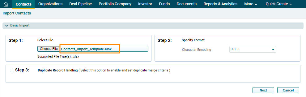 4. Once you choose the file, it will be reflected in Step 1. Based on the file chosen, Step 2 will be auto filled. In Step 3, you can specify whether to Skip, Overwrite, or Merge the duplicate records, if any. Complete the steps and click Next.