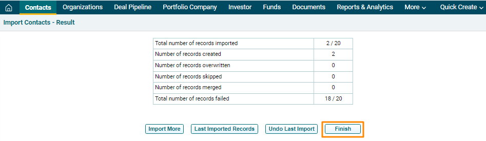6. You will see different options here. You can Import More records, download Last imported Records, Undo Last Import, and Finish. To complete the Import, click Finish.