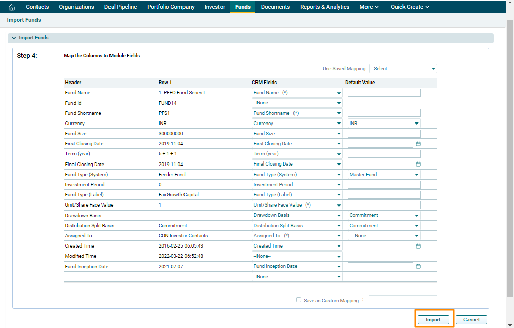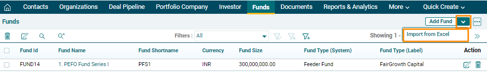 2. Click on the down arrow button next to Add Fund button in the top right corner. Click on Import from Excel.