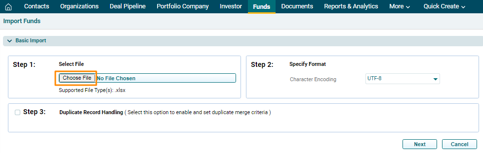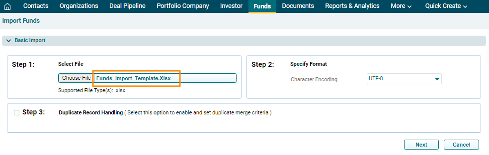 4. Once you choose the file, it will be reflected in Step 1. Based on the file chosen, Step 2 will be auto-filled. In Step 3, you can specify whether to Skip, Overwrite, or Merge the duplicate records, if any. Complete the steps and click Next.