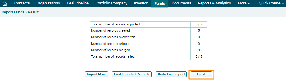 6. You will see different options here. You can Import More records, download Last Imported Records, Undo Last Import and Finish. To complete the import, click Finish.
