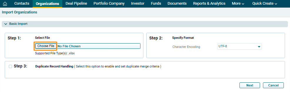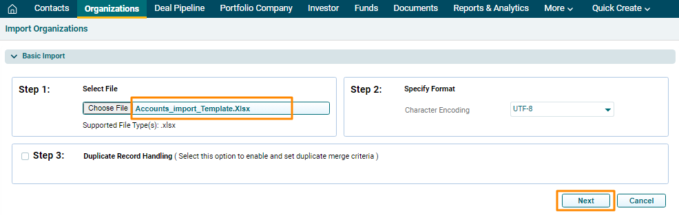 4. Once you choose the file, it will be reflected in Step 1. Based on the file chosen, Step 2 will be auto filled. In Step 3, you can specify whether to Skip, Overwrite, or Merge the duplicate records, if any. Complete the steps and click Next.