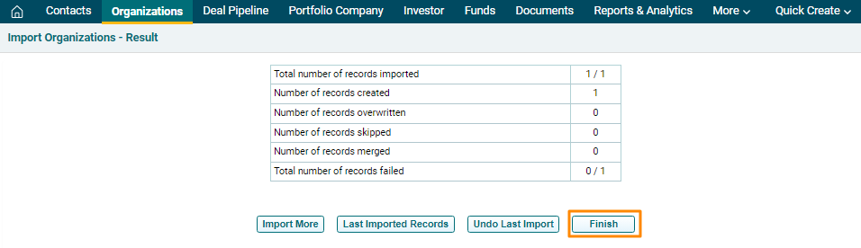 6. You will see different options here. You can Import More records, download Last imported Records, Undo Last Import, and Finish. To complete the Import, click Finish.