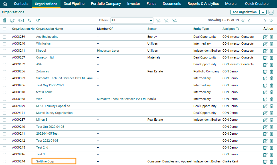 2. Click on the down arrow button next to Add Organization button in the top right corner. Click on Import from Excel.