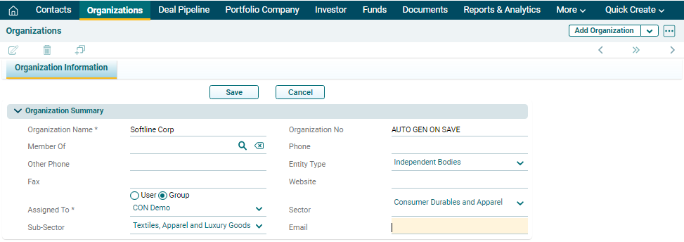 3. The Organization Information window is displayed. Update all the mandatory fields marked with an asterisk and click Save.