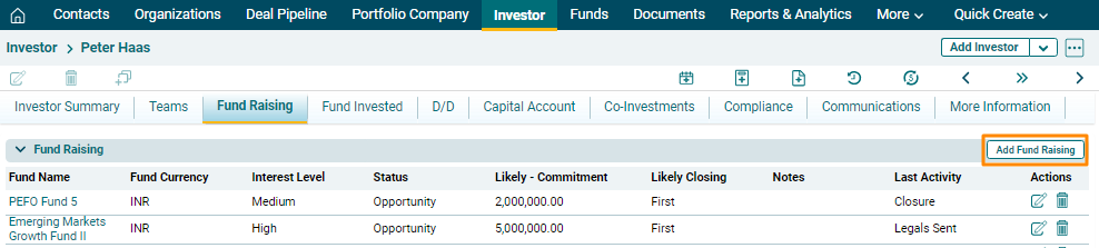 The Fund Raising panel contains information about potential investors who can invest in funds. The details included are: