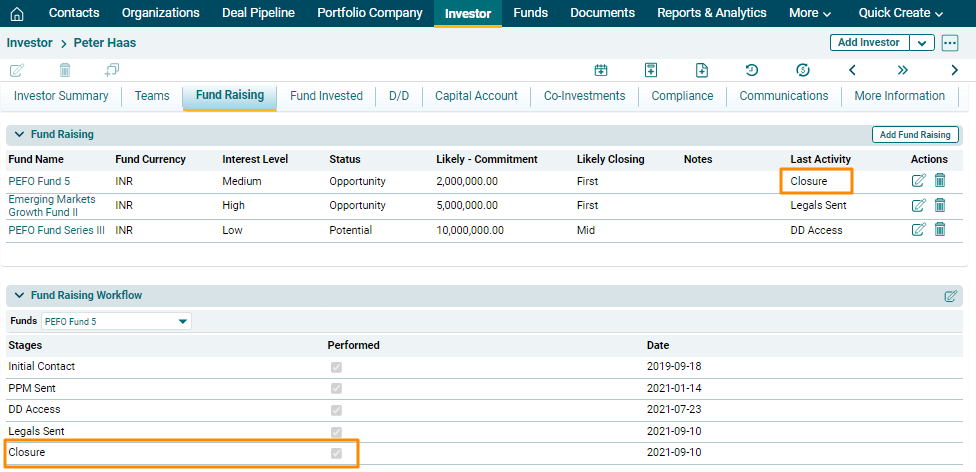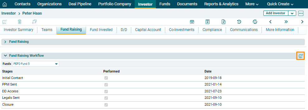 The Fund Raising Workflow panel allows you to capture the stages of fundraising that an investor goes through during the investment process in a fund.
