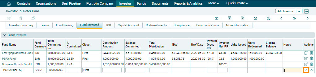 • % Committed: Displays the percentage of investment committed in this fund. This is an auto-calculated field.