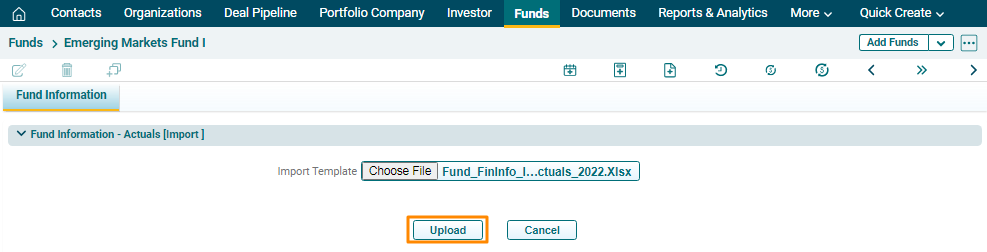 2. The Fund Information- [Panel Name] [Import] window is displayed. Click on Choose File. Choose the file.