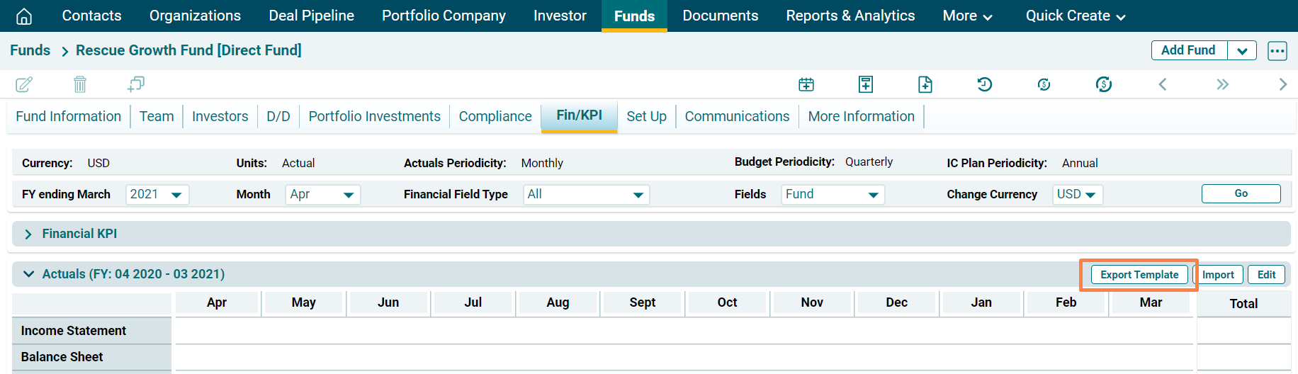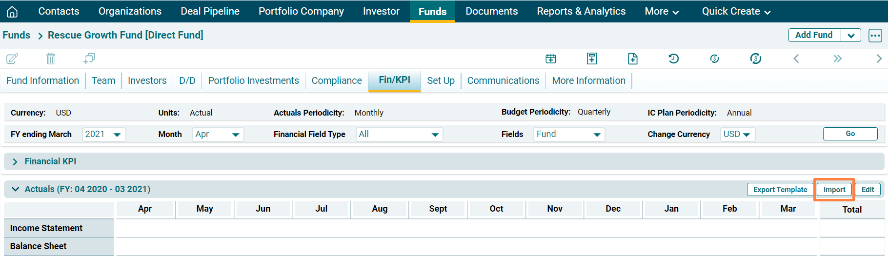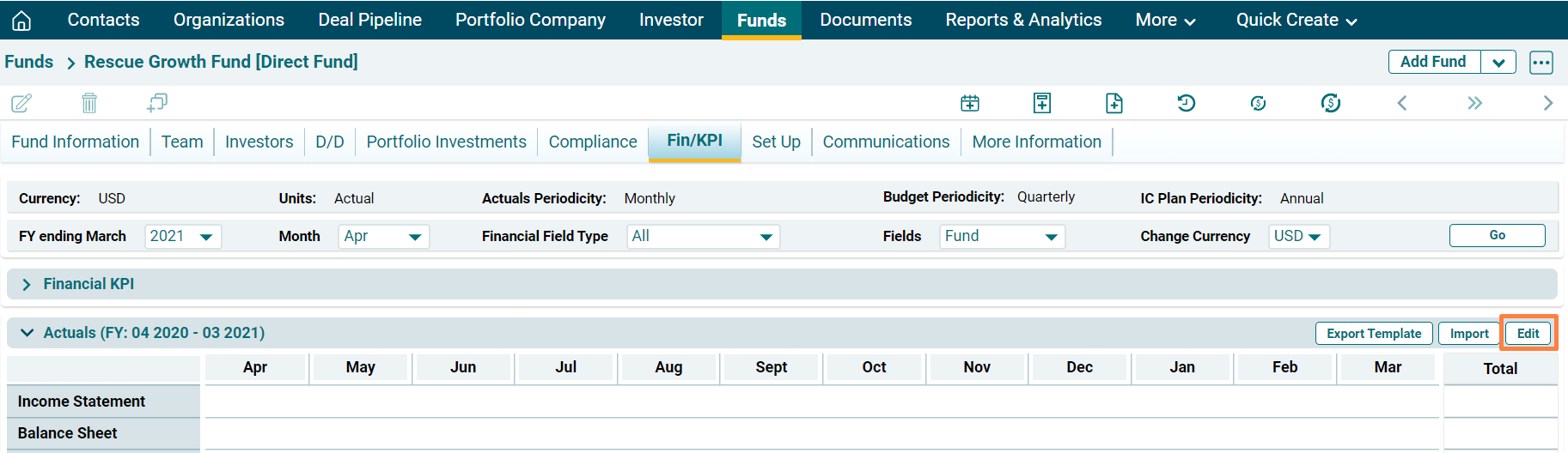 You can capture three cases of Financials/KPI - Actual, Budget, and IC. You can edit data on the screen, import data via excel, and export data to excel for each of these cases.