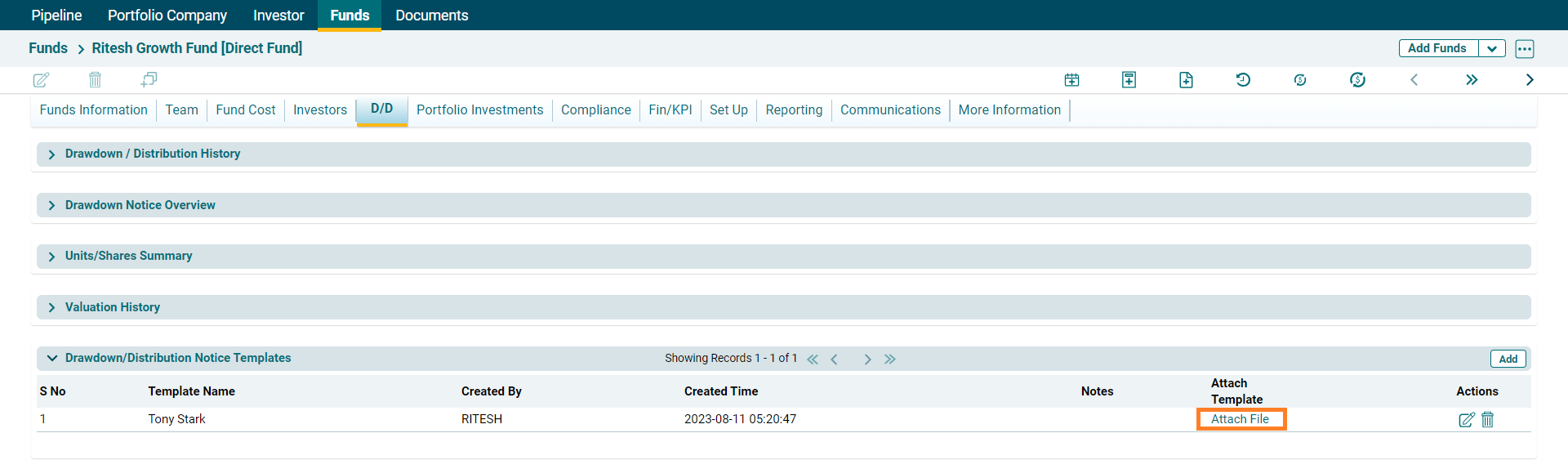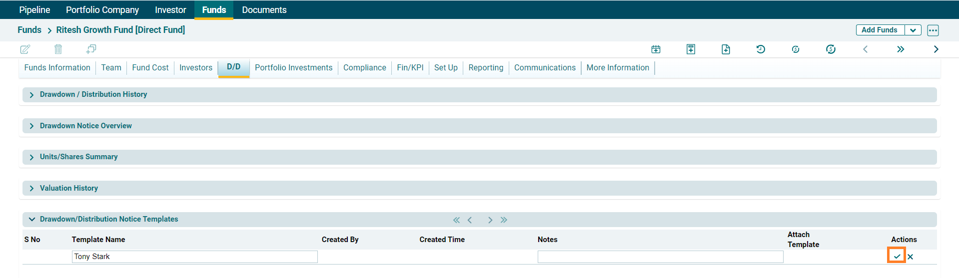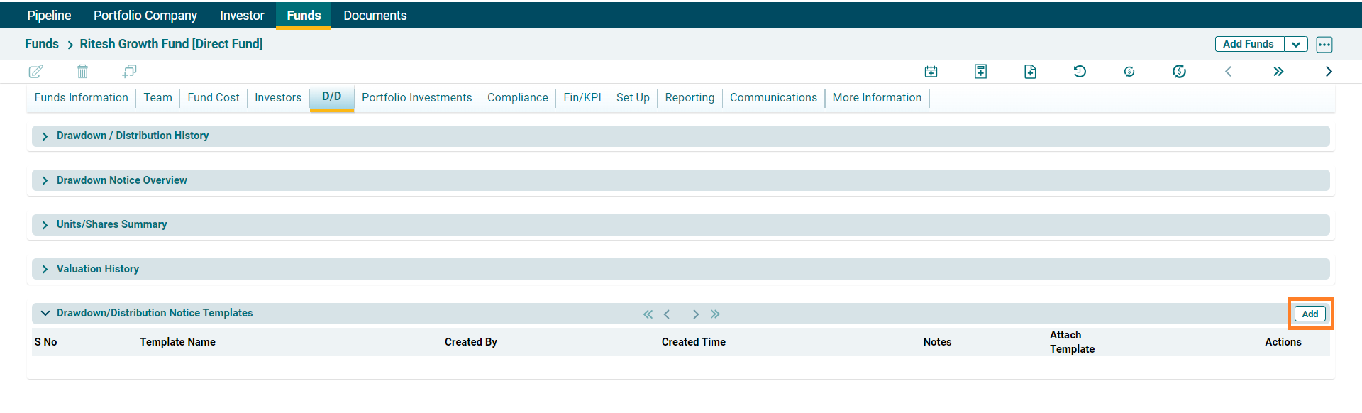 Drawdown Distribution Notice Template panel allows you to create different drawdown and distribution notice templates that can be sent out to investors via mail merge email comunication tool.