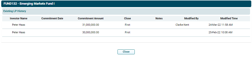 ) icon in the Actions Column. The Existing LP History window is displayed which shows when were the changes made and by whom along with the details of the investor.
