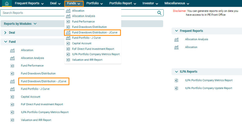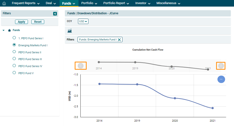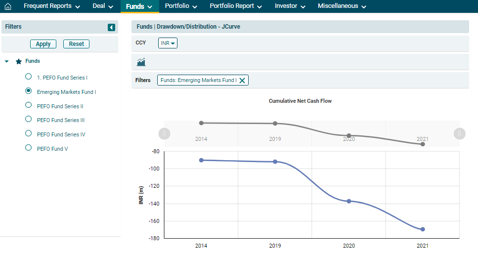 3. The Funds| Drawdown/ Distribution -JCurve window is displayed. Using the filters on the left-hand side,