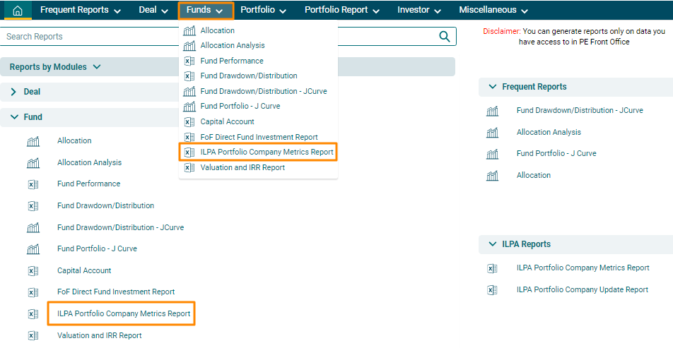 2. You can access the report from the dashboard by clicking ILPA Portfolio Company Metrics Report in the Funds panel or from the Funds drop-down menu in the blue vertical bar.