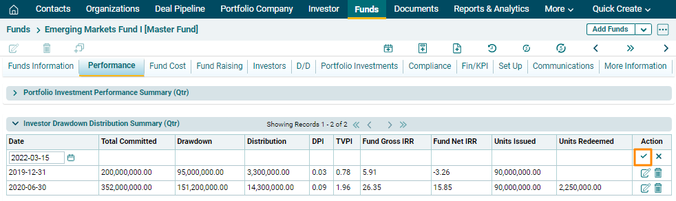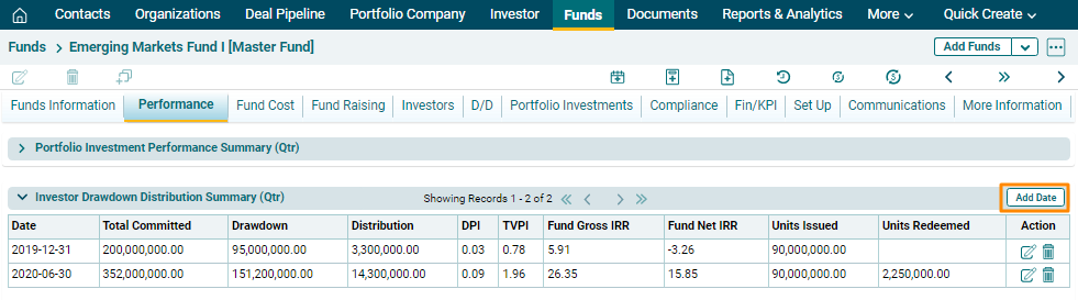 You can view and download data related to drawdown and distribution from and to investors. You can specify the date range for which the drawdown distribution summary has to be viewed. The fields are auto-calculated and the data auto-populates from different tabs. The details included are: