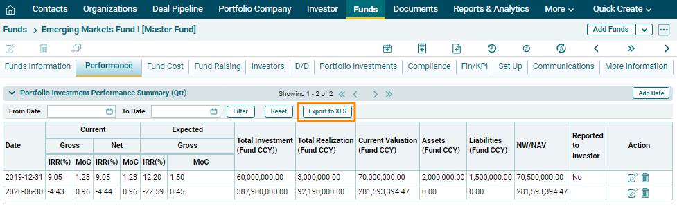 To export the Portfolio Investment Performance Summary (Qtr) data into excel, click on the Export to XLS button in the horizontal bar of the panel. The Excel file will download.