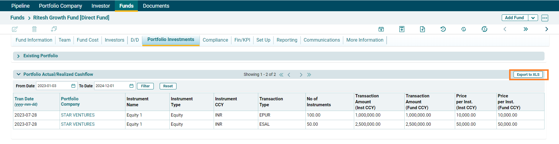 To export the Portfolio Actual/ Realized Cashflow data into excel, click on Export to XLS button in the horizontal bar of the panel. The Excel file will download.