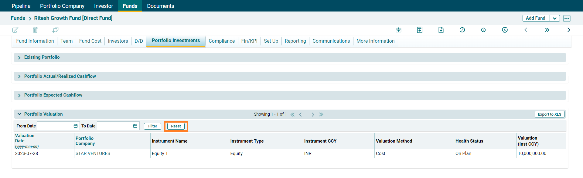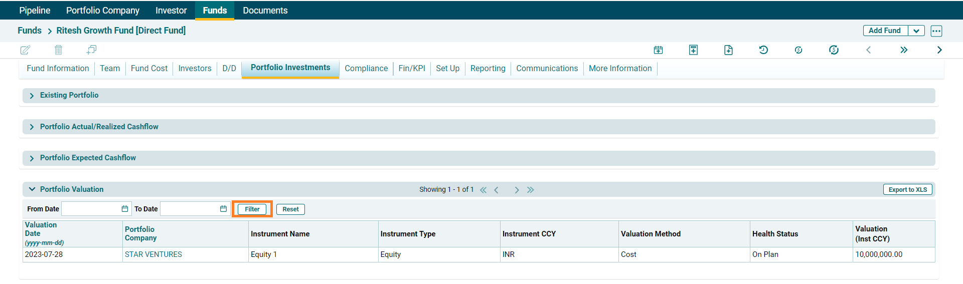 Portfolio Valuation panel allows you to view the valuation summary of instruments of Portfolio Company in which investments have been made. This panel is populated from the Portfolio Company module. This panel is applicable to Direct Fund, Master Fund, Fund SPV, and Fund of Funds. The details included are: