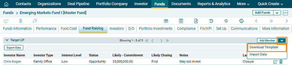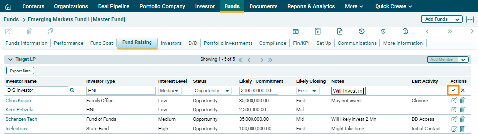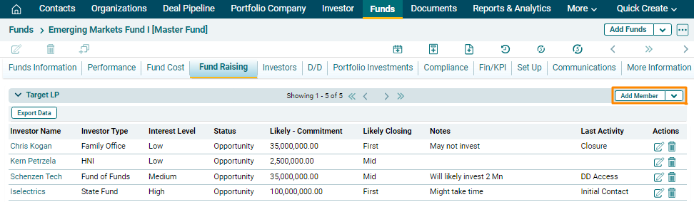 Target LP captures the potential investors who are willing to invest in the fund and track the progress of fundraising. This panel is applicable to Master Fund, Feeder Fund, Fund SPV, and Fund of Funds.