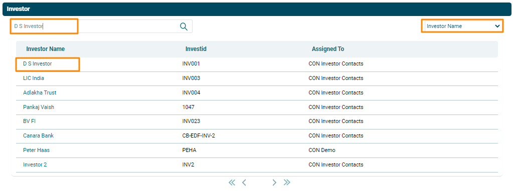 3. The Investor window is displayed. Search for the Investor name. Select the filter on the top right corner. Search results are displayed. Click on an Investor name to add them as a member.
