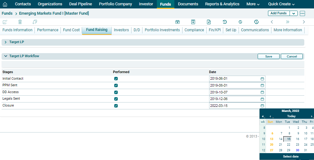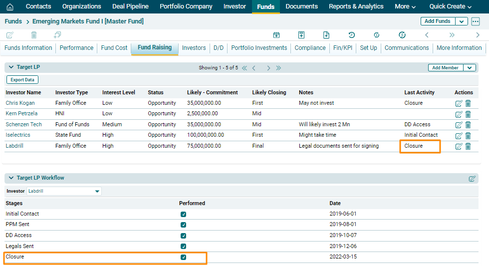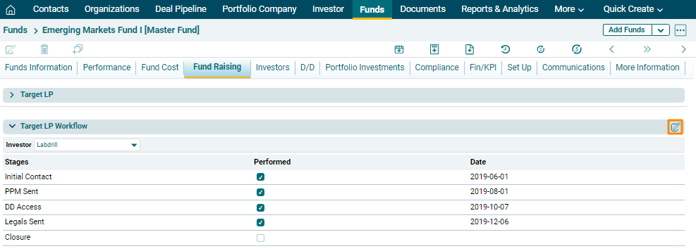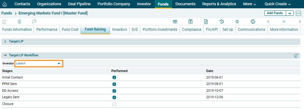 Target LP Workflow panel allows you to capture the workflow related to potential investors’ investment in a fund. This panel is applicable to Master Fund, Feeder Fund, Fund SPV, and Fund of Funds.