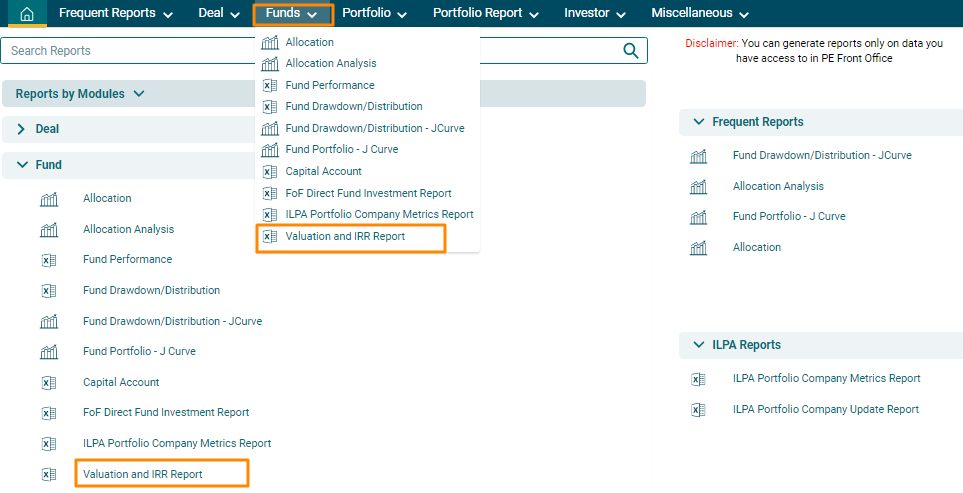 2. You can access the report from the dashboard by clicking Valuation & IRR Report in the Funds panel or from the Funds drop-down menu in the blue vertical bar.